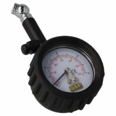 Professionele bandendrukmeter van QSP met grote klok (Ø 9cm) waardoor het zeer goed afleesbaar is en de grote scalering (tot 2,8 bar / 40PSi) maakt deze de ideale partner op het circuit.